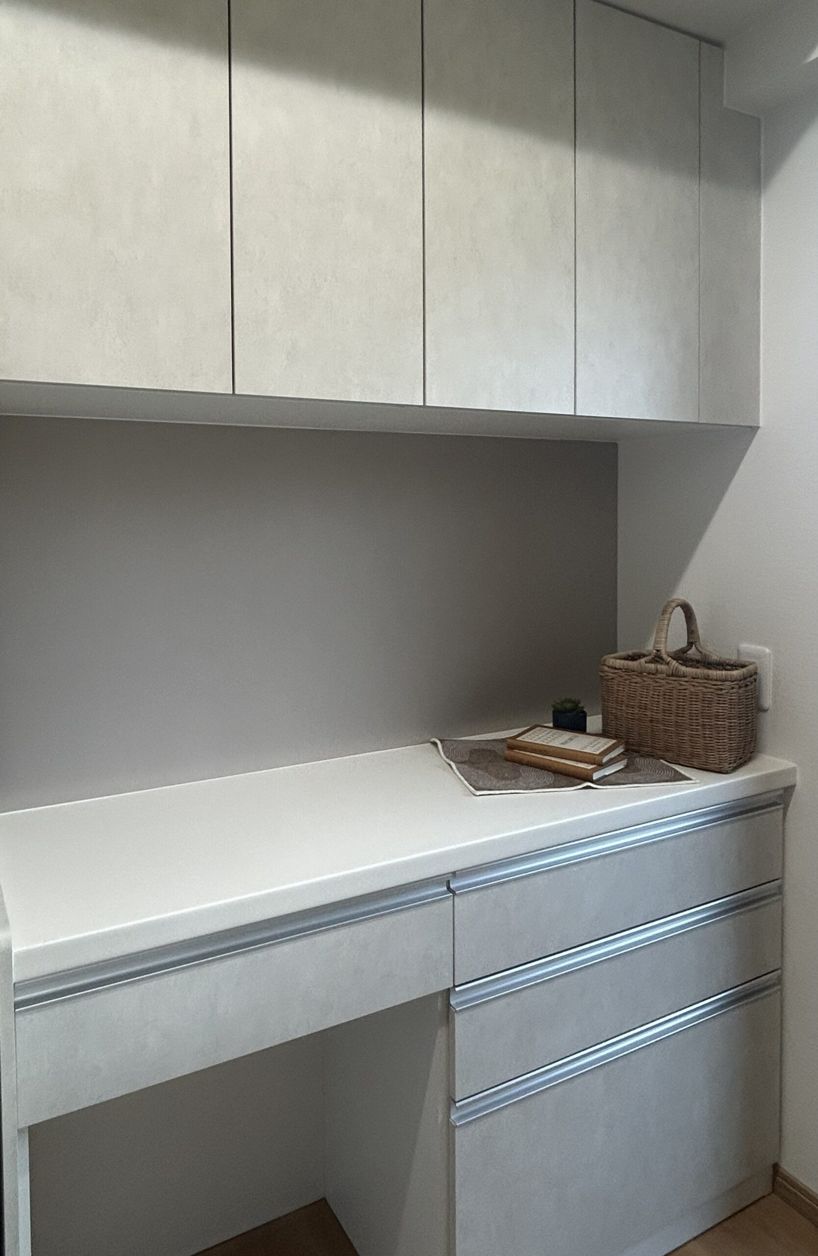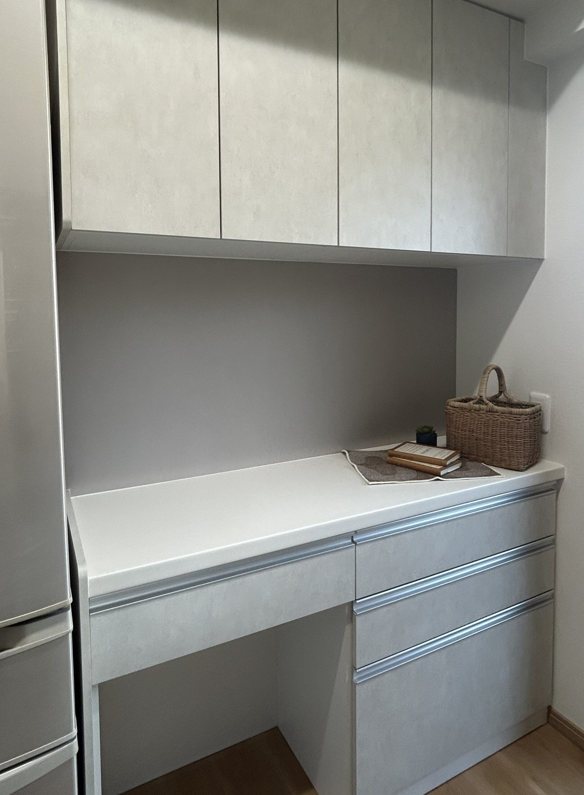 カップボード背面の壁には、キッチンのカラーに合わせたグレーのアクセントクロスを貼り、空間に統一感を持たせました。