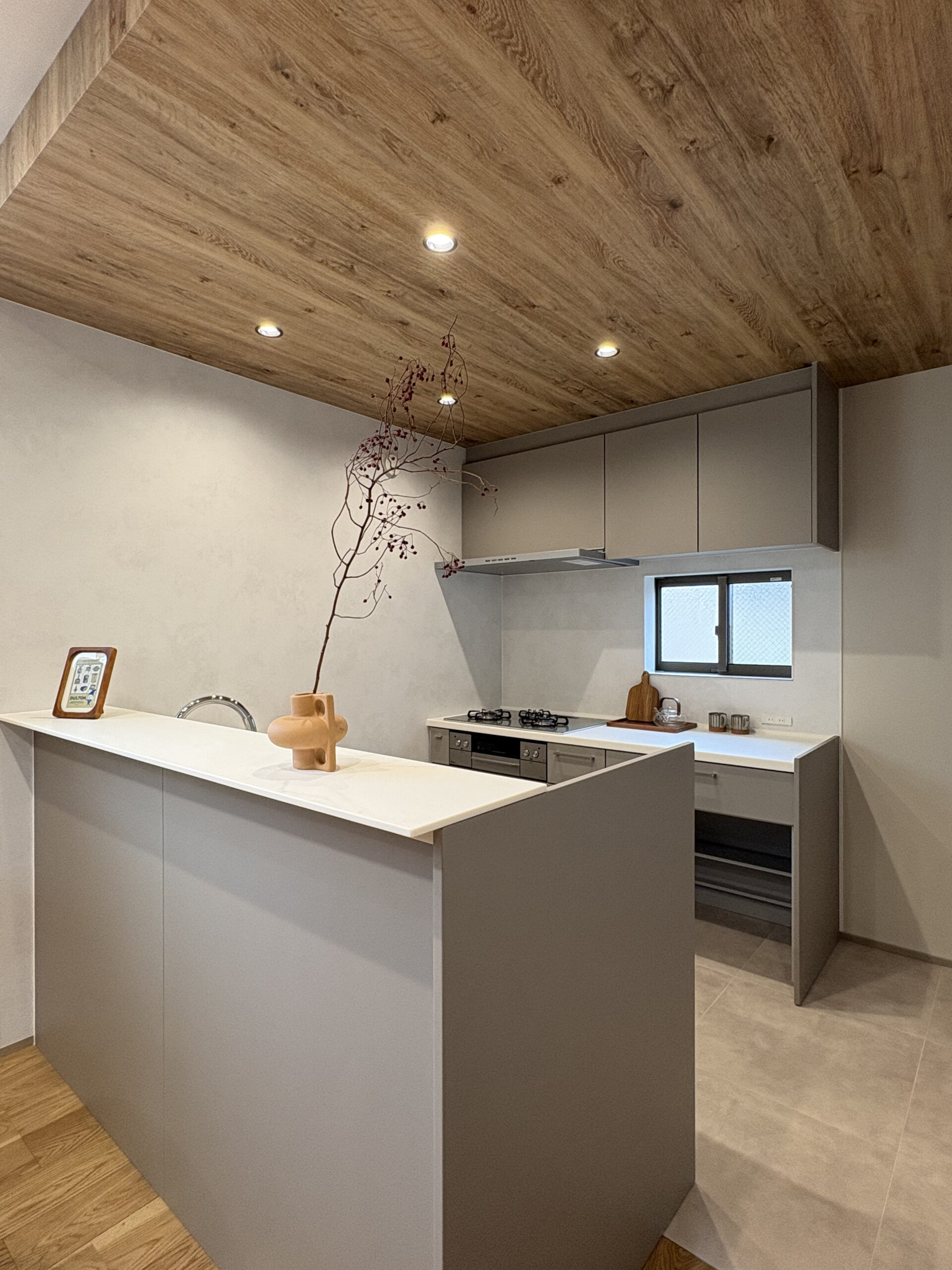 キッチンだけ天井を下げ、ゾーンをゆるやかに分けました。柔らかなインテリアテイストを崩さないように角をアールにしました。