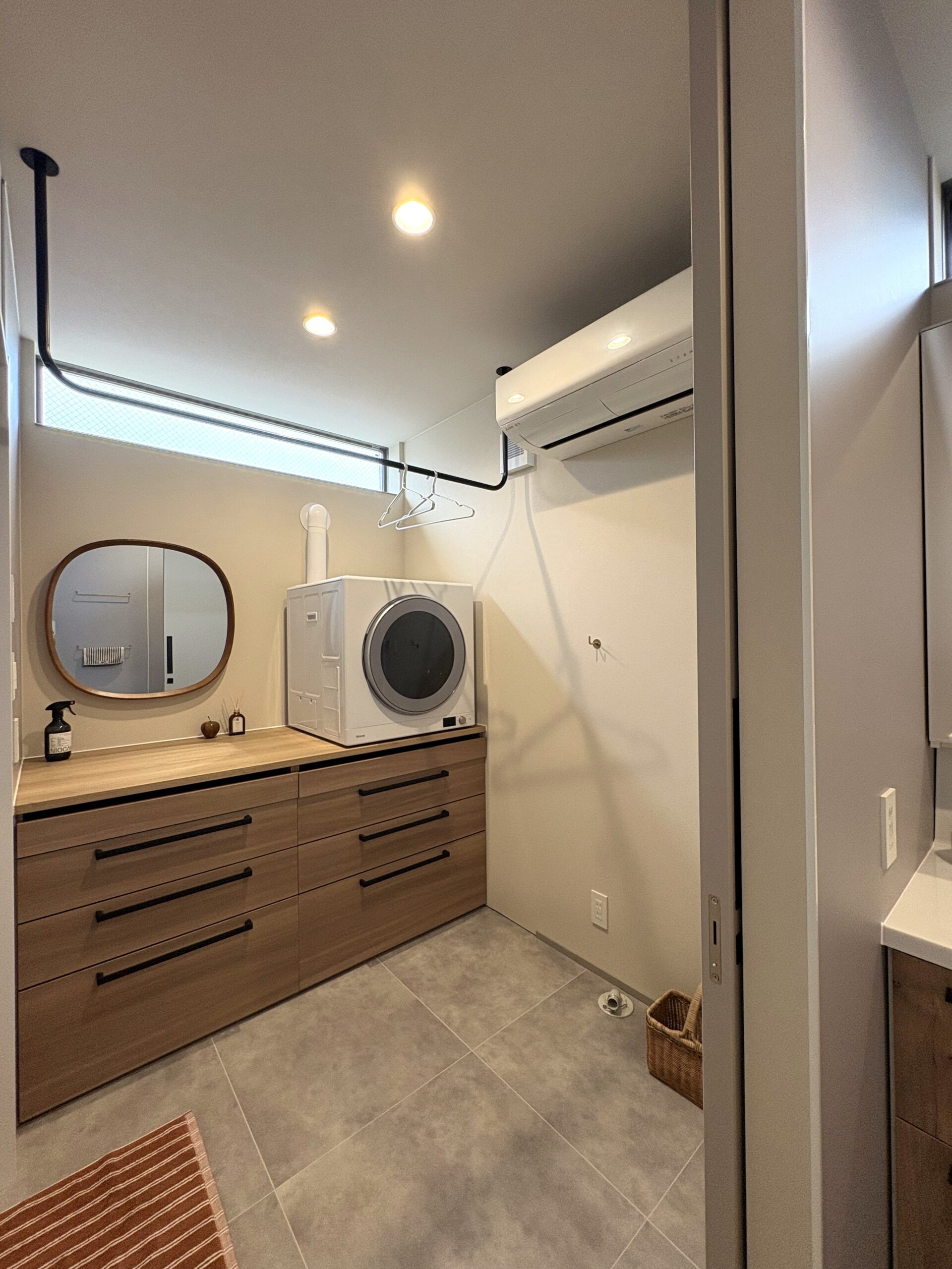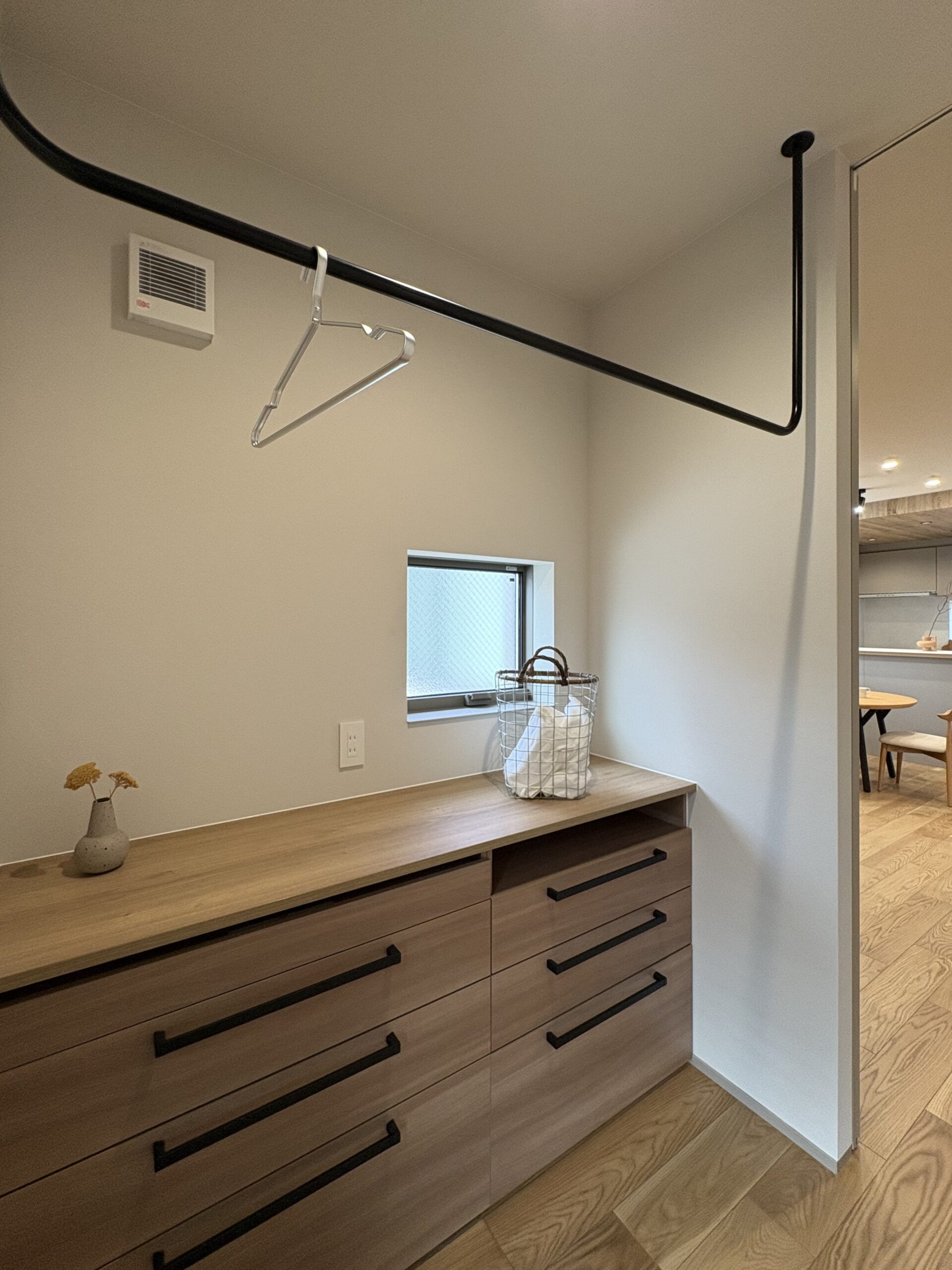 リビング横にランドリールームをつくりました。湿気がこもらないように換気扇・窓を設けました。