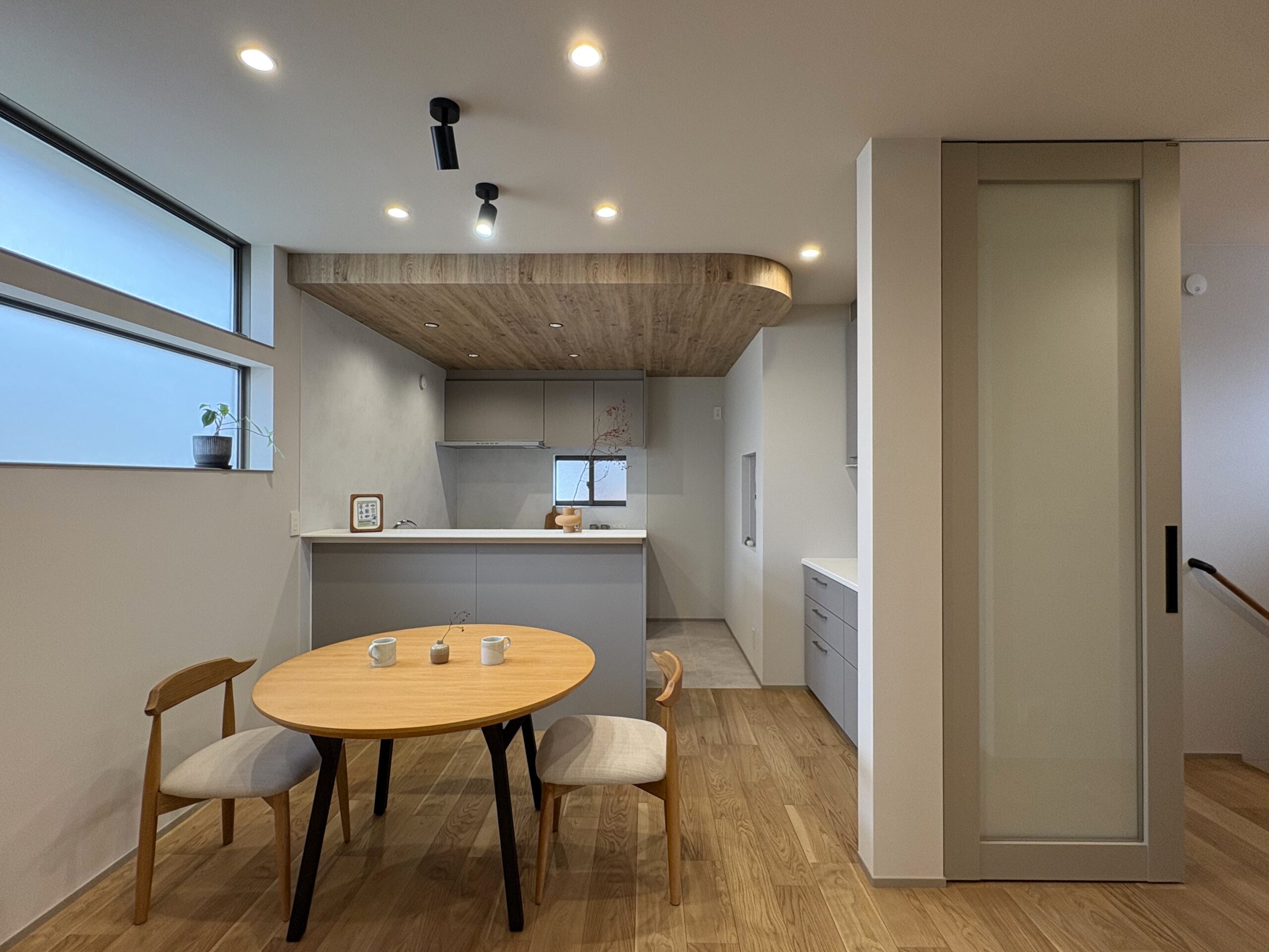 生活シーンが変わる入口の開口をアールにし、ゆるやかに仕切りました。またキッチン下がり天井のアールとも雰囲気を合わせました。