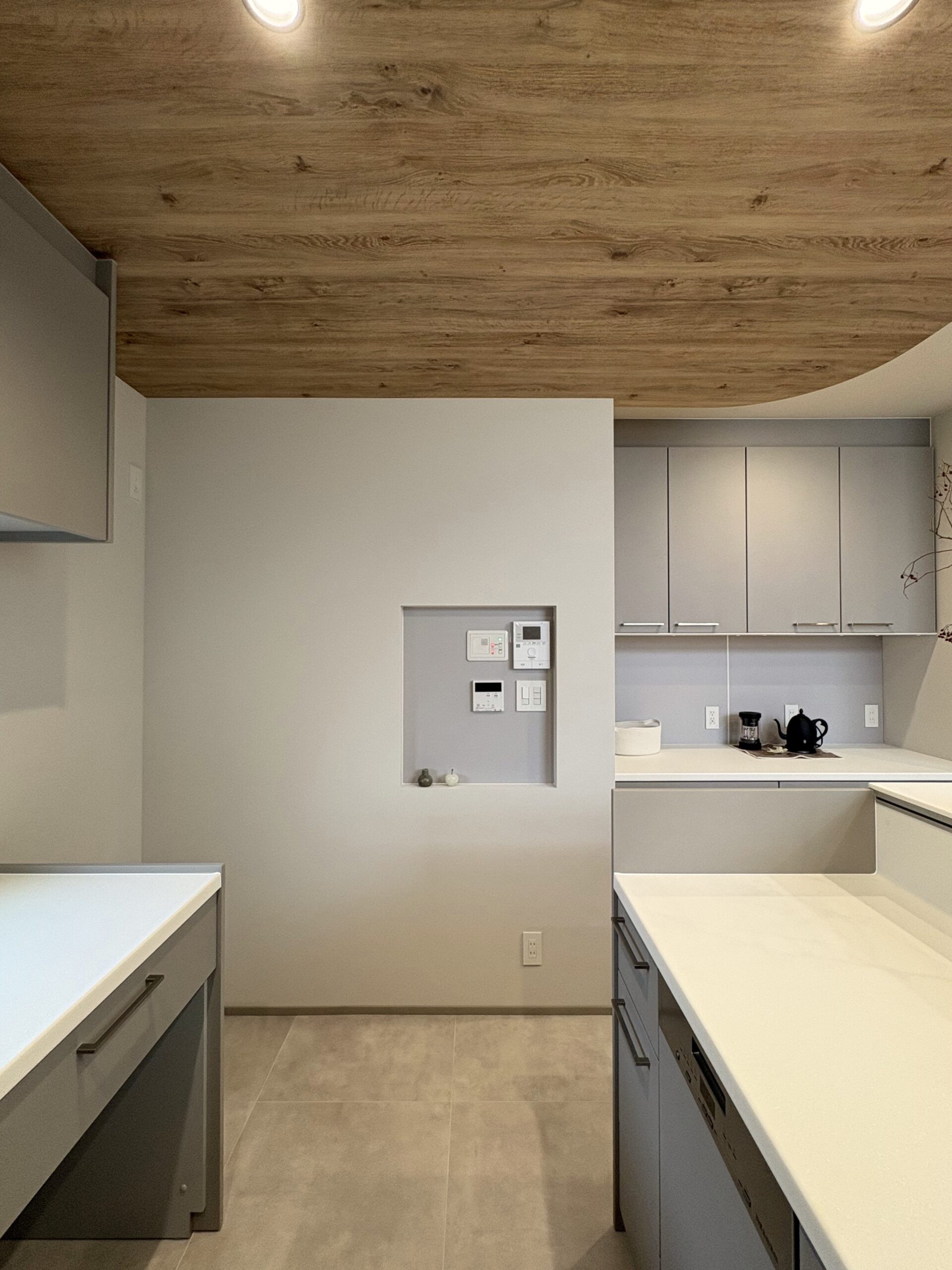 色んな場所に点在しがちなリモコンやスイッチをアクセスしやすいキッチン横の1ヶ所にまとめました。また壁面を凹みを活用してニッチをつくり、すっきり整えました。