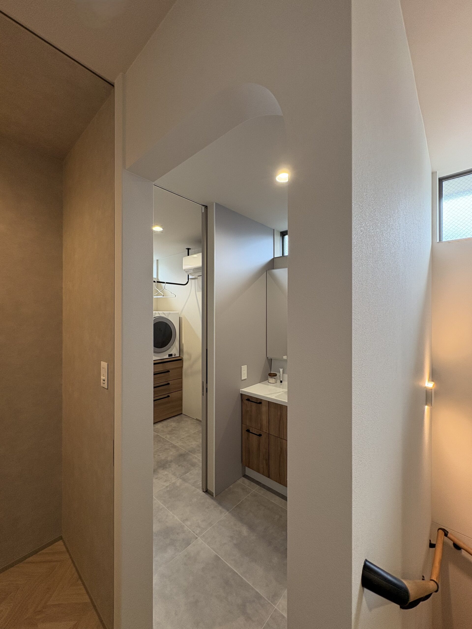 アール開口をくぐると、W1200の広々とした洗面スペース。両側面にはマグネットパネルを貼り、暮らしに合わせてカスタマイズできます。また、家族分のフェイスタオルが掛けれるように真鍮バーを取り付けました。