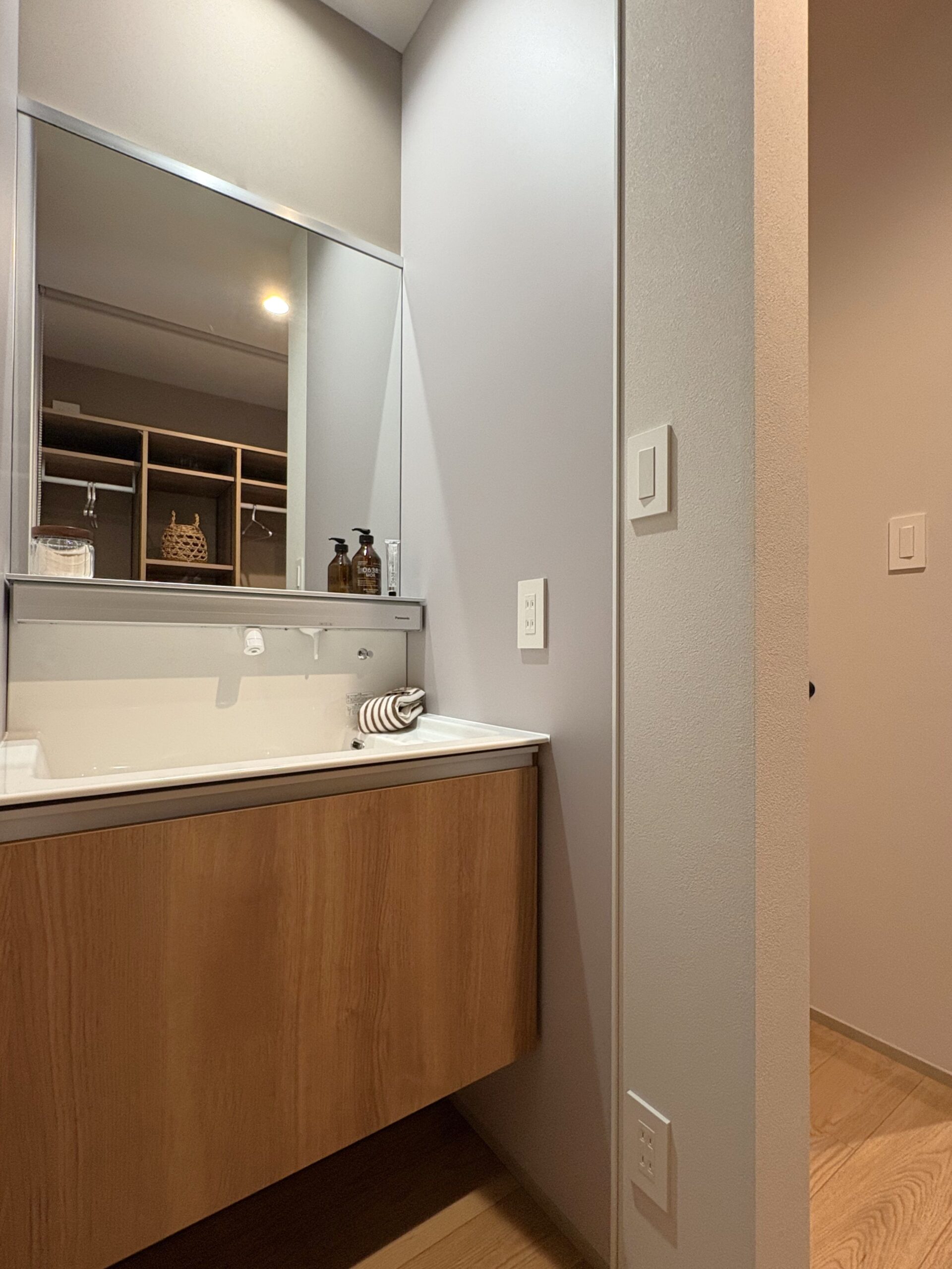洗面スペースの横に脱衣スペースをつくりました。扉で仕切ることができるので、プライバシーを確保でき、朝の支度も混雑も解消できます。脱衣スペースには、メイクやヘアアレンジができるようにミラーとコンセントを設置しました。