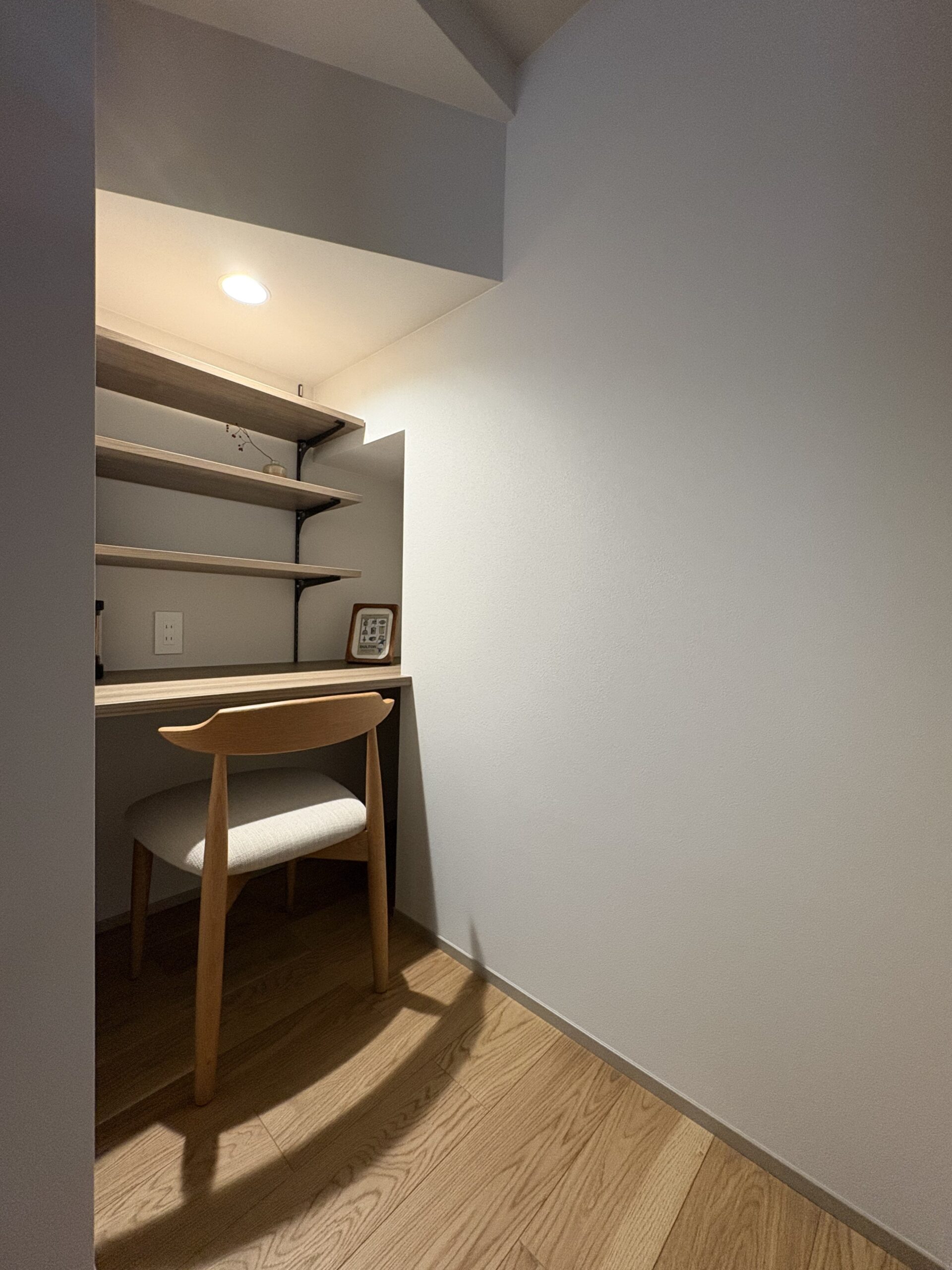 寝室内にご主人のための書斎スペースをつくりました。階段下でもあるので、おこもり感のある空間で趣味に没頭できます。