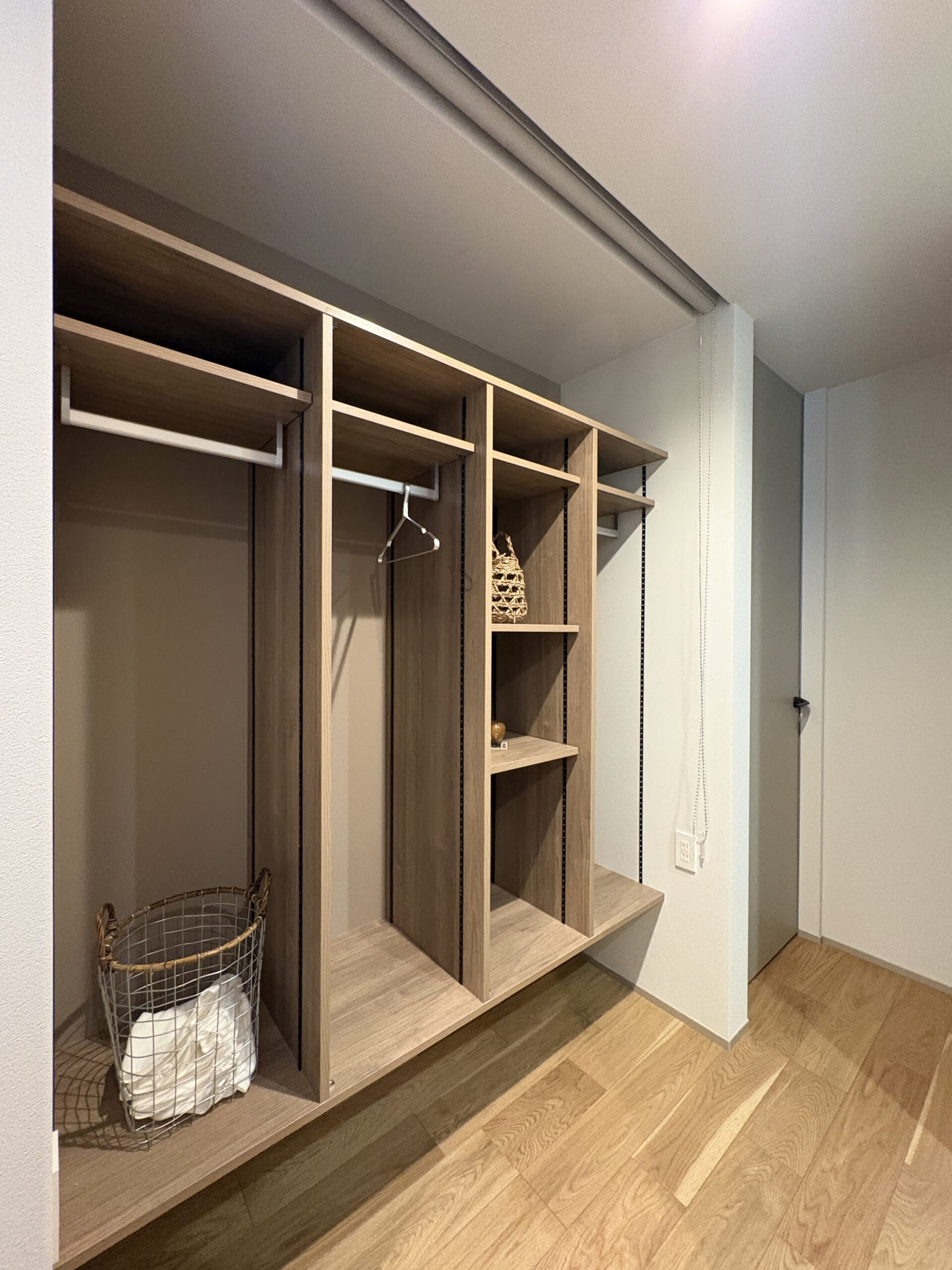 帰宅動線を考えて、玄関横にシューズクロークを設けました。 靴を履いたまま出入りでき、靴やストック類、コートも収納できるようにしました。