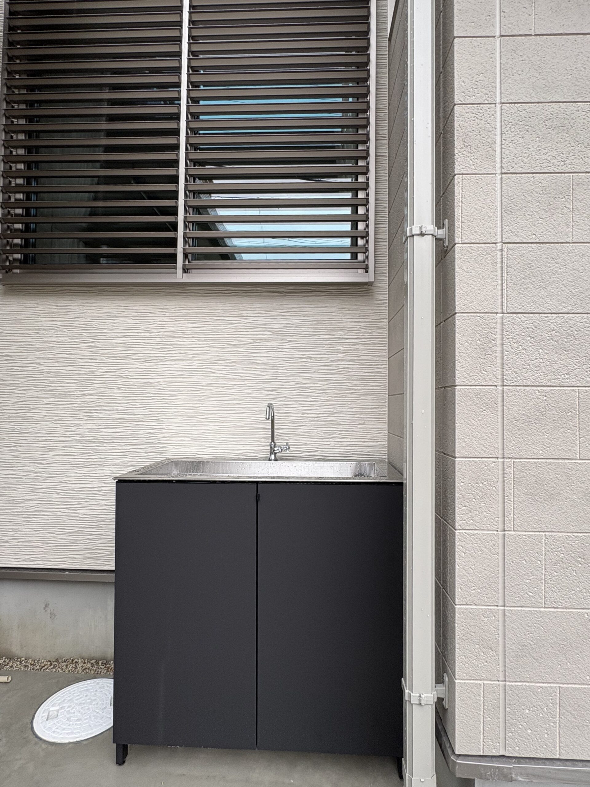 Exterior 02. ガーデンシンク ― 扉付きの収納で、室内に入れたくない物をしまうことができます。またお子様の道具や、靴などを楽な姿勢で洗えるように設置しました。