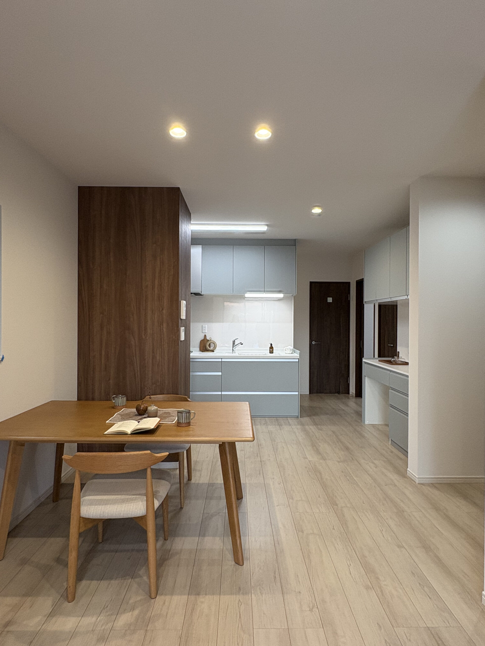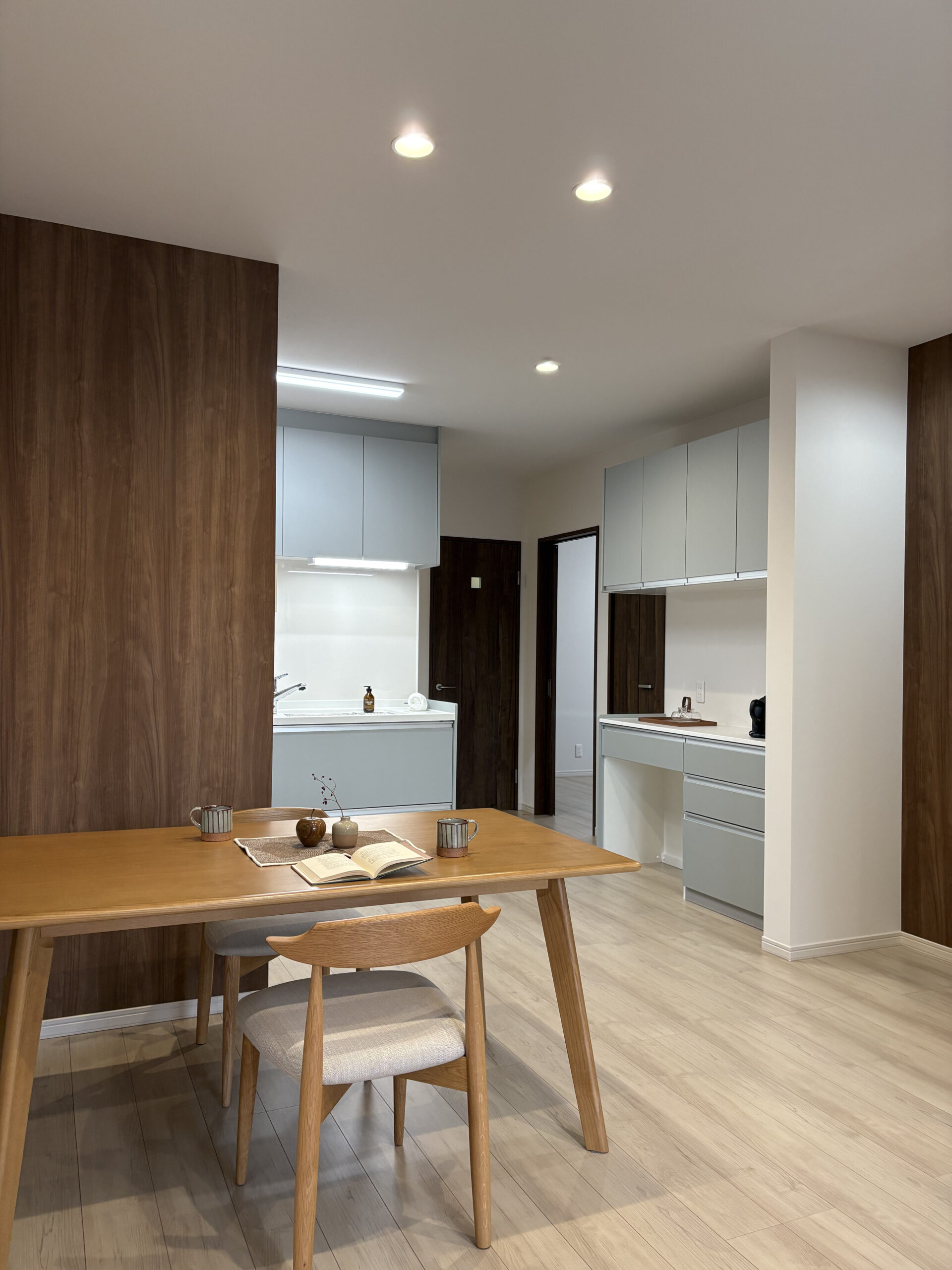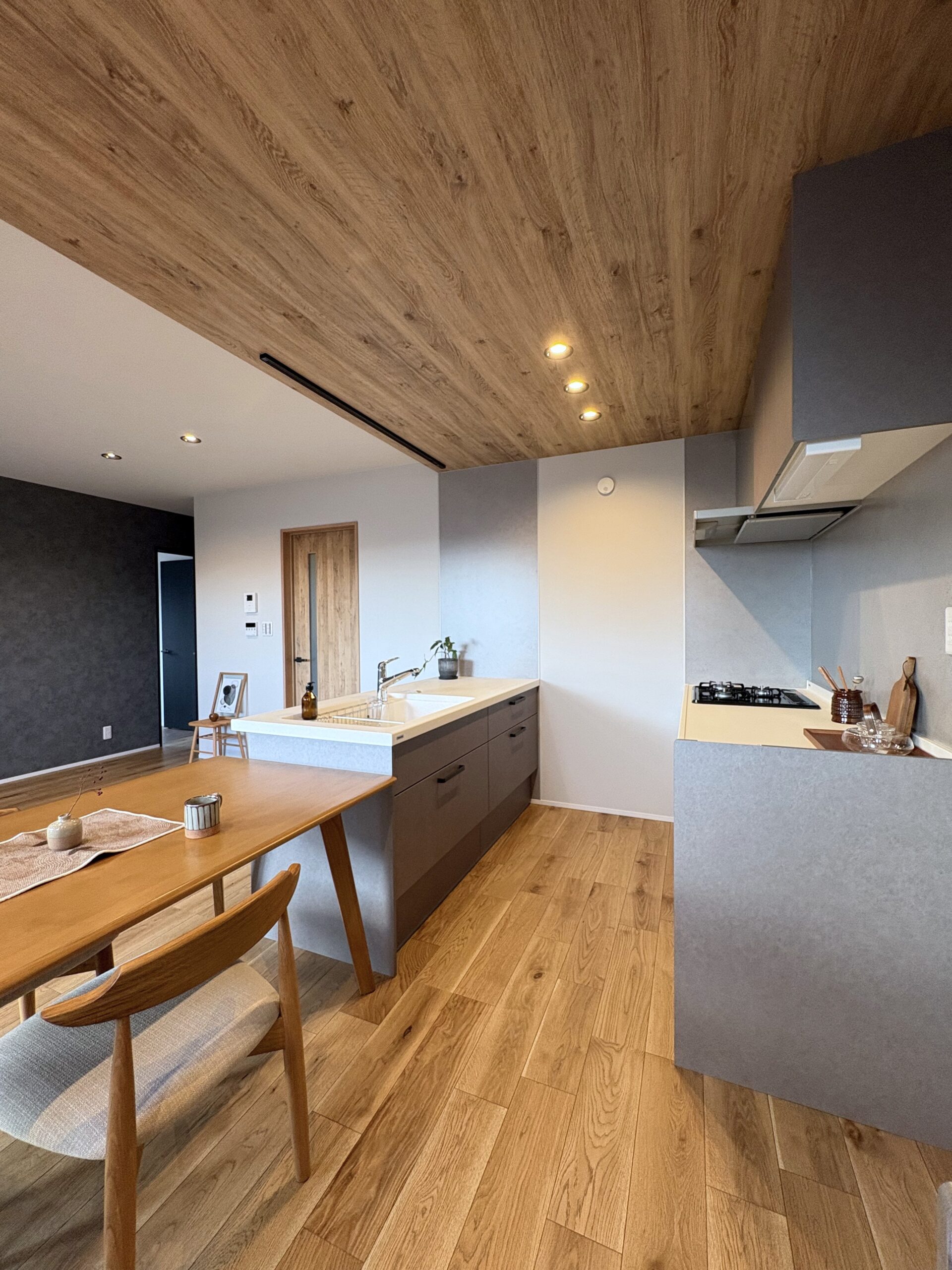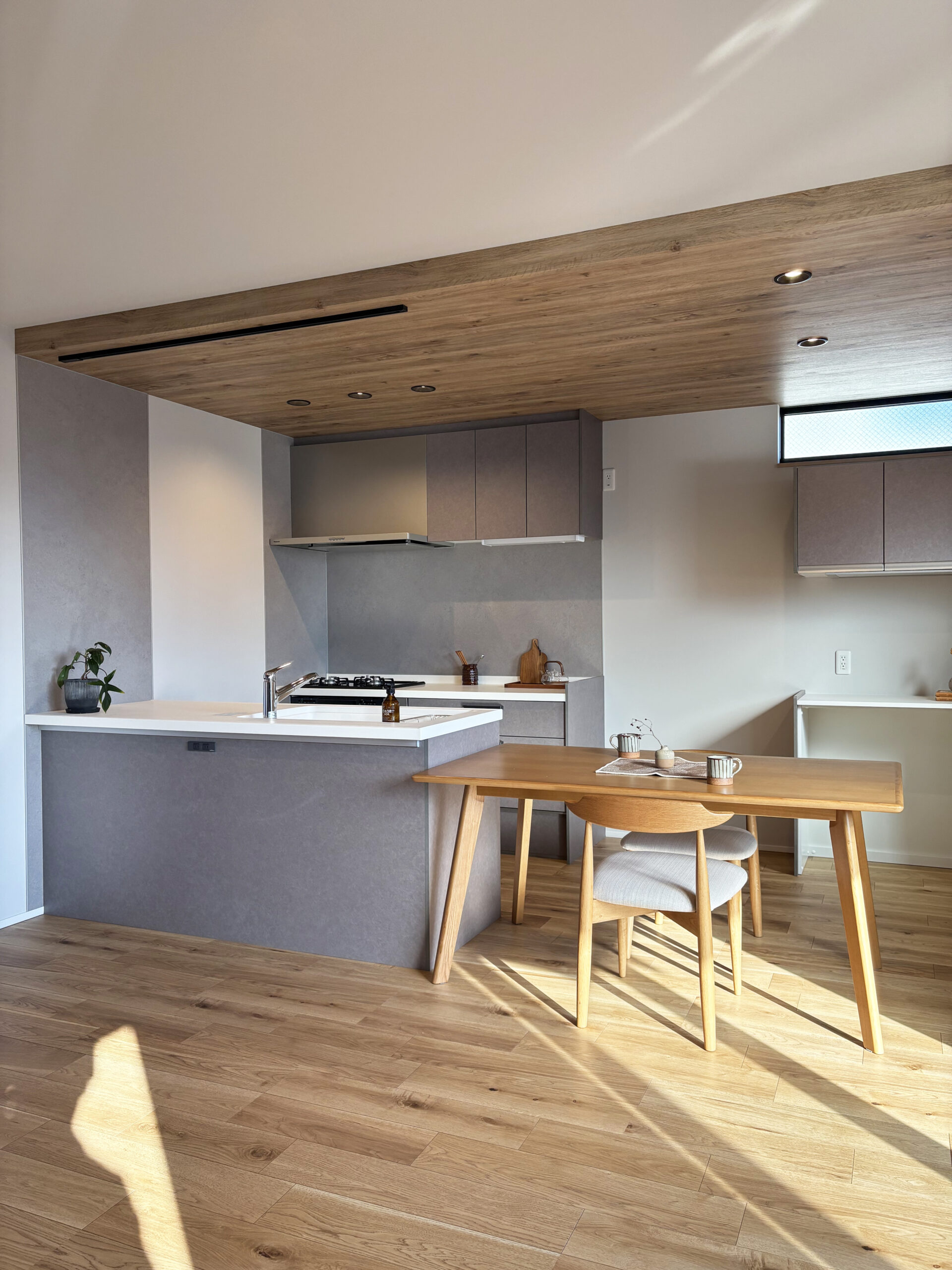 キッチンのみ天井を下げ、空間をゆるやかに仕切りました。また、木目のクロスを取り入れ、奥行きと温かみを感じられる仕上がりに。