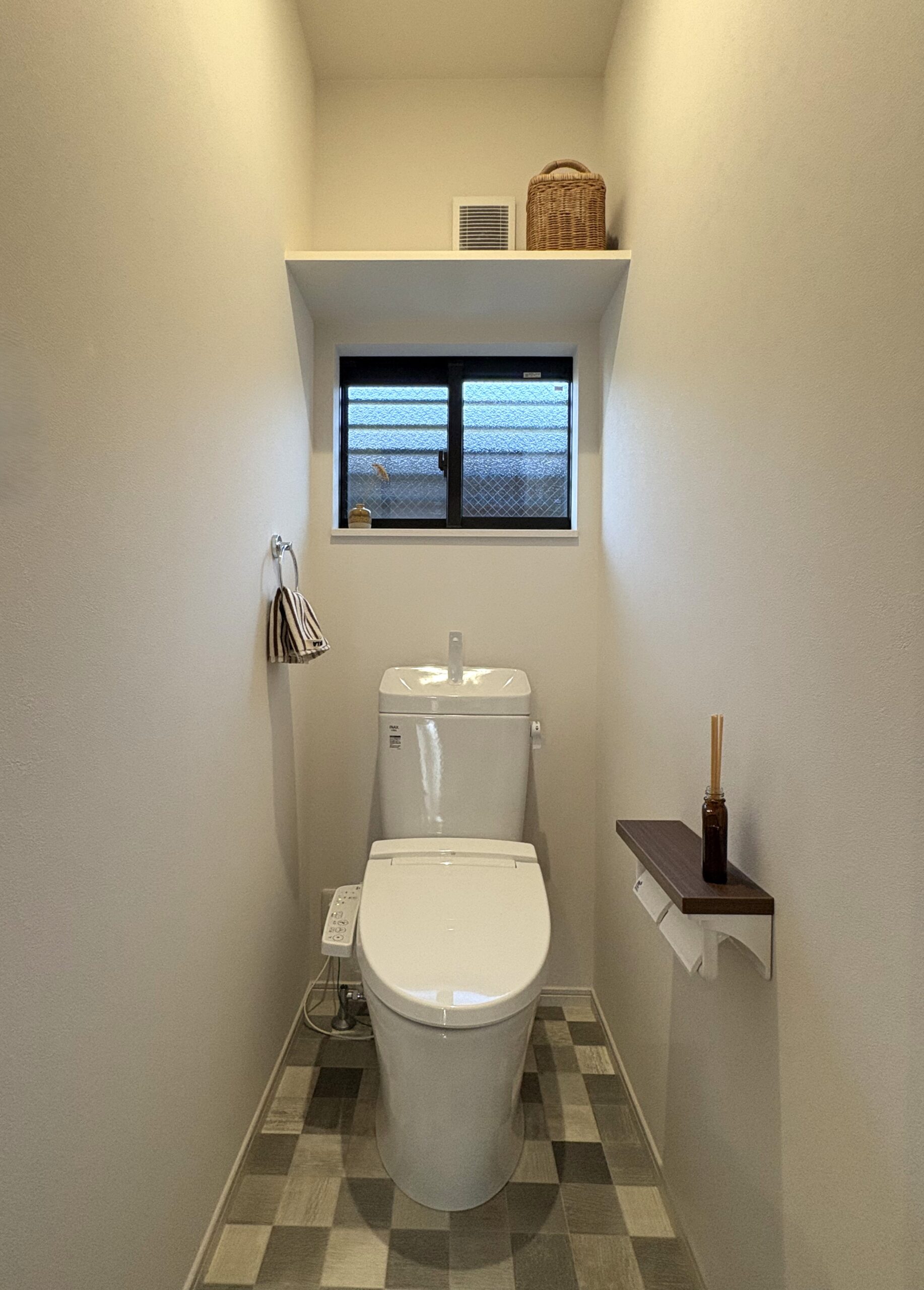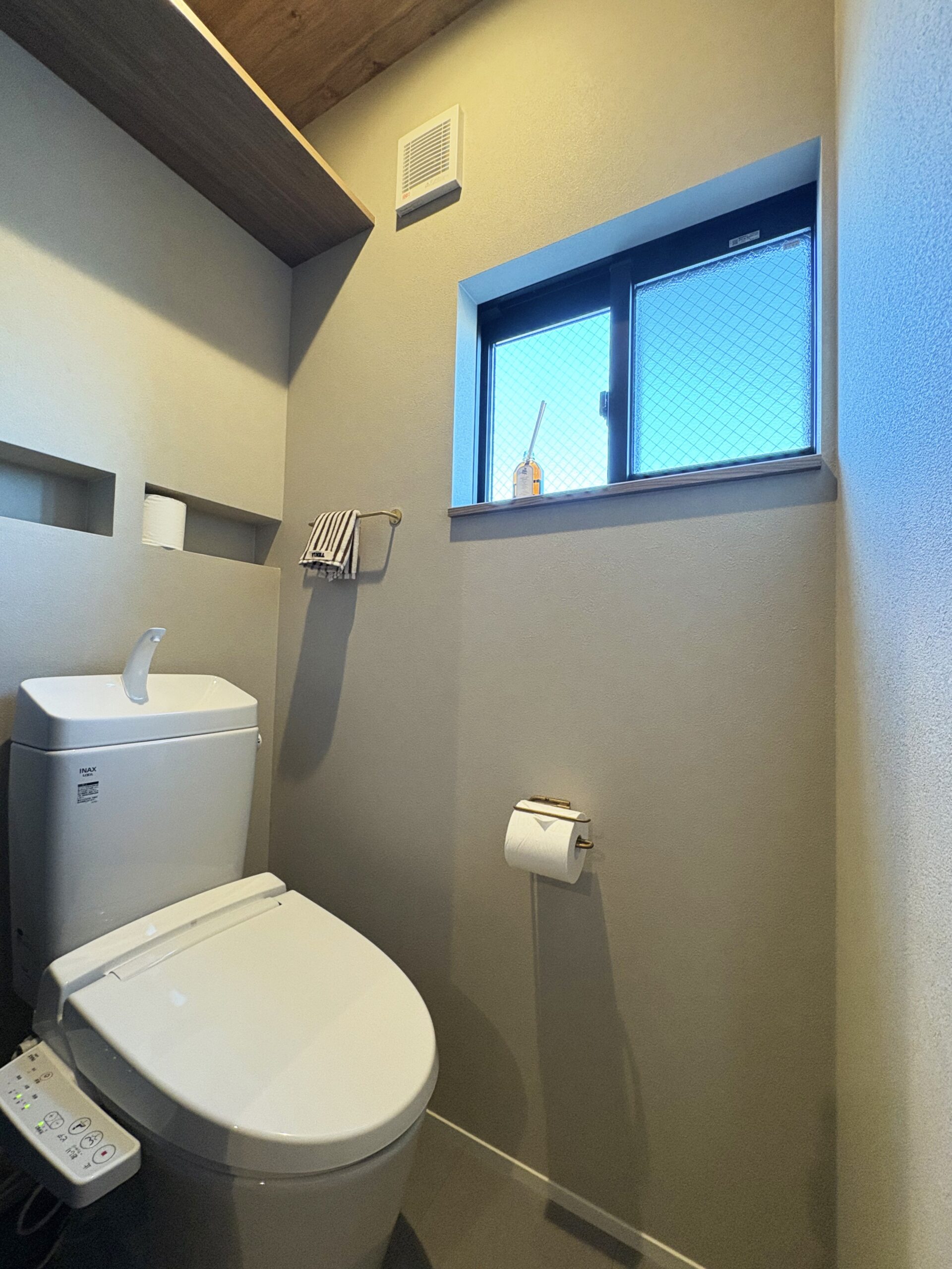 Toilet ― トイレットペーパーがおけるニッチを背面にデザイン。グレージュの色合いで空間全体が柔らかい雰囲気に。