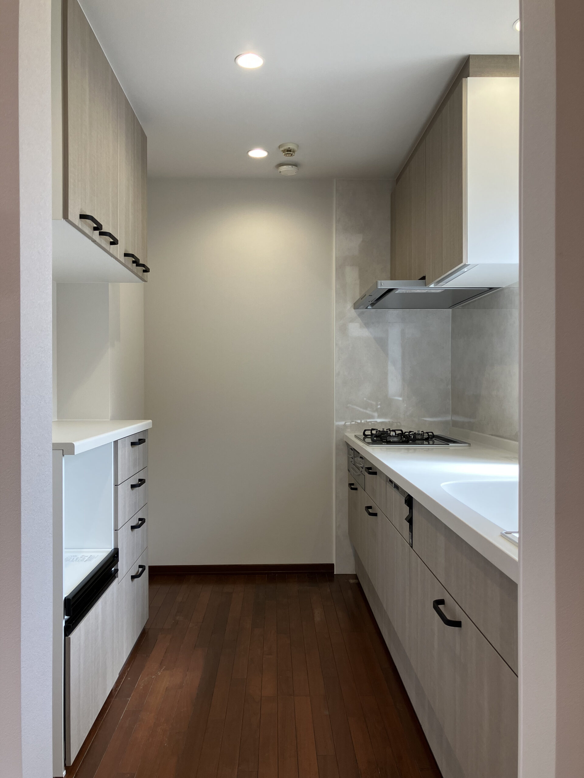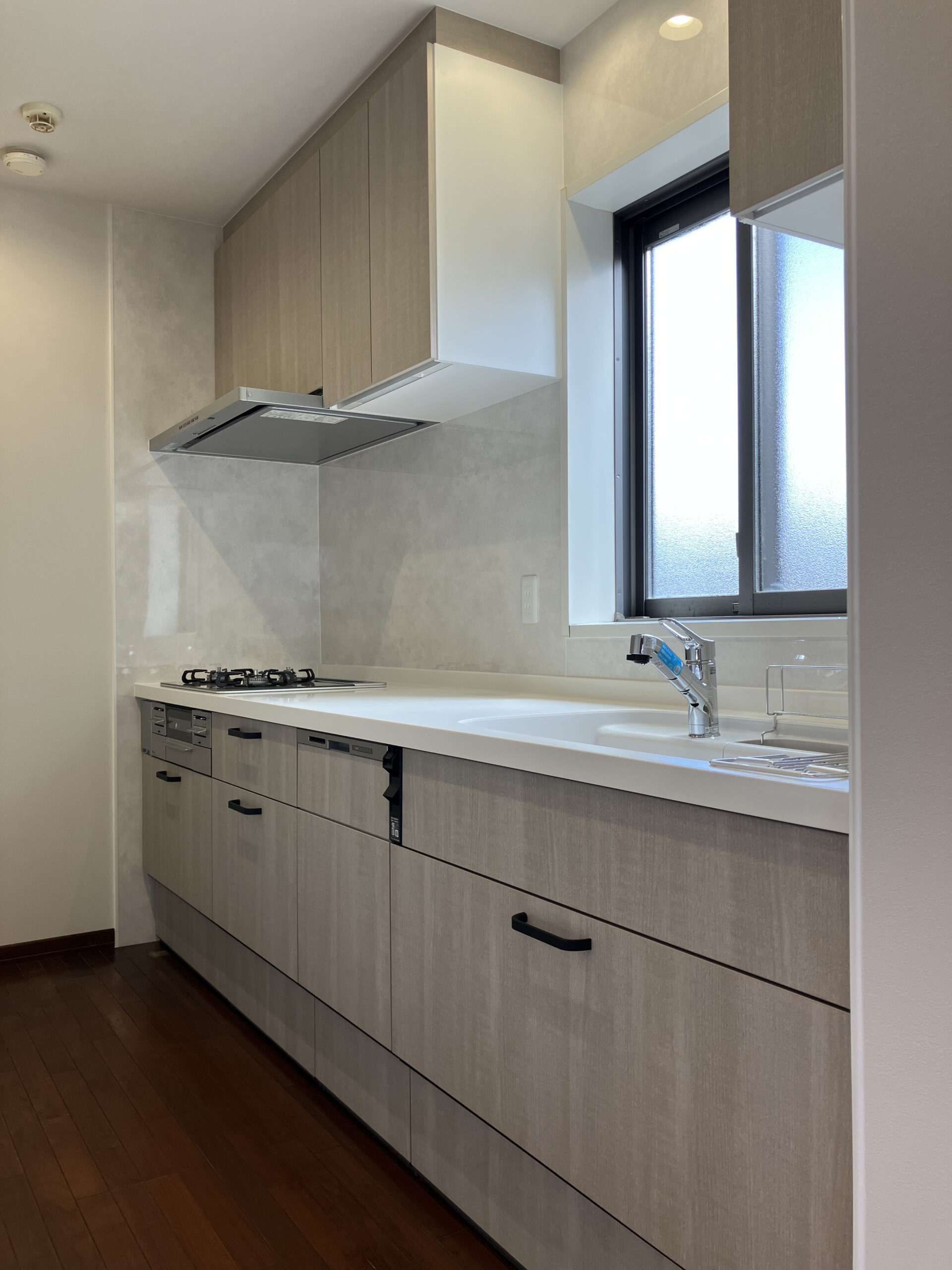 キッチンにはグレイッシュなカラーを採用し、落ち着きのあるやわらかな空気感に。
